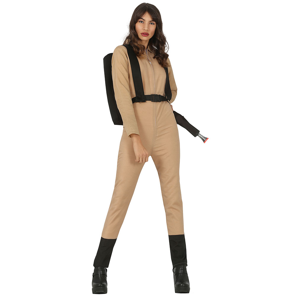 Spökjägare Maskeraddräkt Dam omfattar en spökjägare maskeraddräkt med en beige jumpsuit och en svart ryggsäck med tryck.