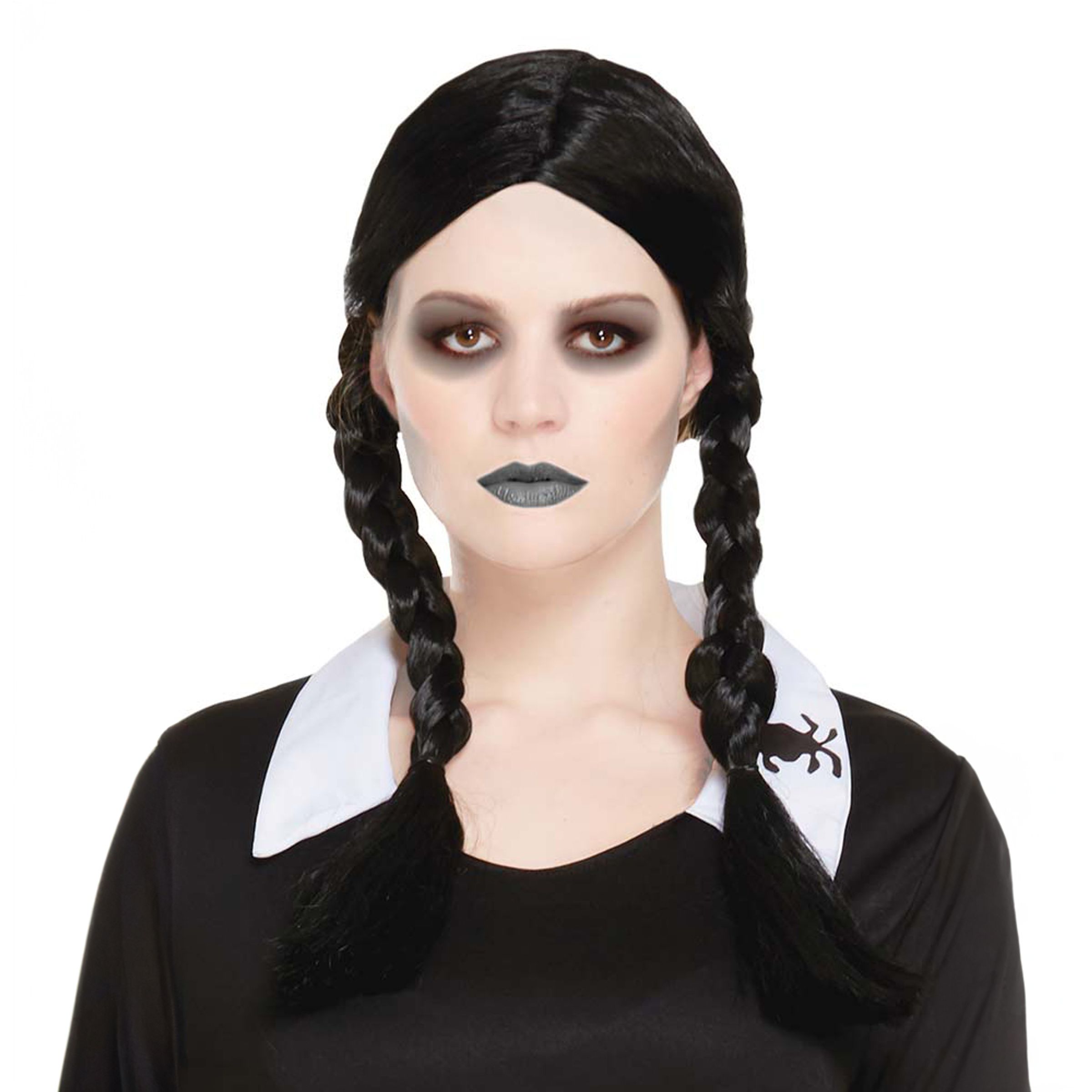 Spöktjej Svart Peruk med Flätor är en svart peruk med långa flätor och svarta rosetter. Perfekt om du ska efterlikna Wednesday från familjen Addams eller någon annan karaktär som har långa svarta flätor på maskeraden.