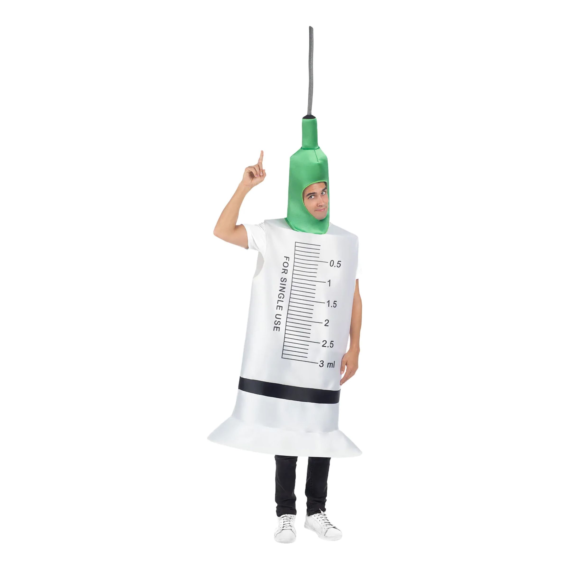 Spruta Maskeraddräkt inkluderar en cylindrisk dräkt med nålhuvud som förvandlar dig till en helglad spruta. Dräkten kommer med hål för armar, ben & ansikte och finns i en storlek som passar de flesta vuxna.