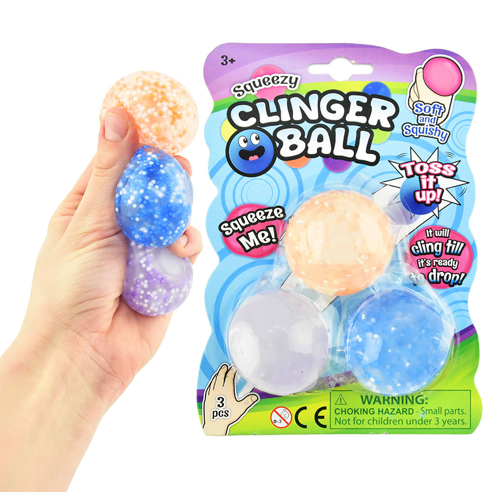 Squeezy Klämbollar 3-Pack omfattar tre stycken mjuka och klibbiga bollar fyllda med geléaktigt material och små kulor i olika färger. Bollarnas klibbiga yta gör att bollarna sitter fast på ytor man kastar de på en liten stund. När bollarna blir smutsiga är det bara att skölja av dem med tvål och vatten, så blir de klibbiga igen.