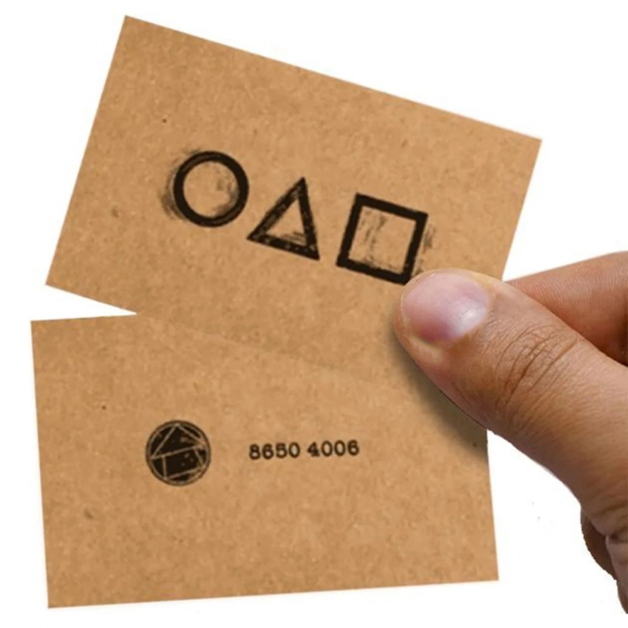 Med inspiration från Netflix populära tv-serie "Squid Game" kommer här inbjudningskort i samma format och design. Dela ut dem som inbjudningskort till festen eller använd dem som visitkort i plånboken.