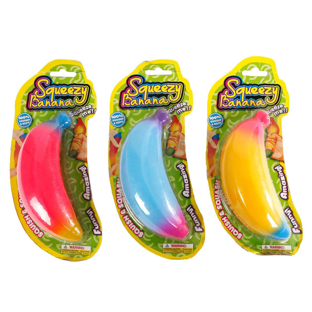 Squishy Banan består av en klämleksak med ett innehåll som känns som mjöl. Bananen mäter ungefär 12 centimeter i längd samt 4,5 centimeter bred. Finns i olika färger, vilken du får blir en överraskning. Säljs styckvis.