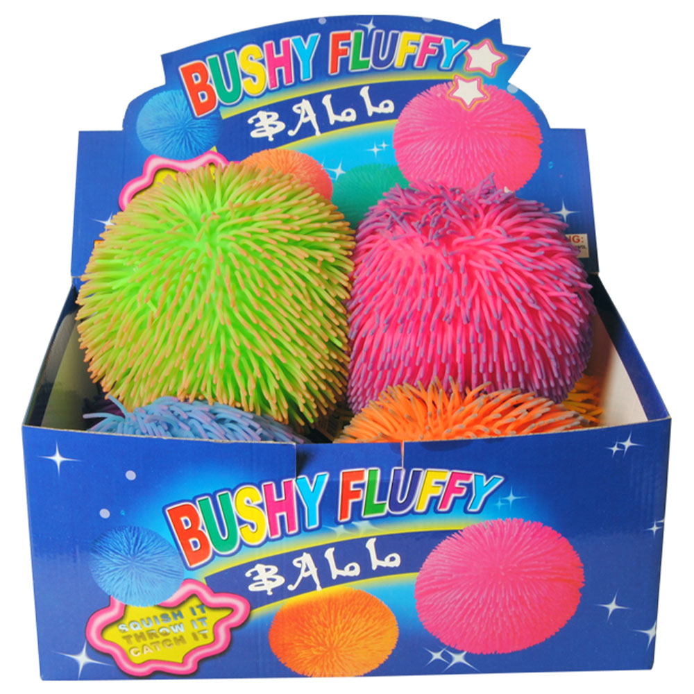 Squishy Puffy Boll 23 cm omfattar en stretchig och mjuk leksak i form av en färgglad boll täckt med gummipiggar och fylld med luft. Bollen har en ögla och finns i färgerna gul, blå, orange, lila eller rosa, vilken du får blir en överraskning.