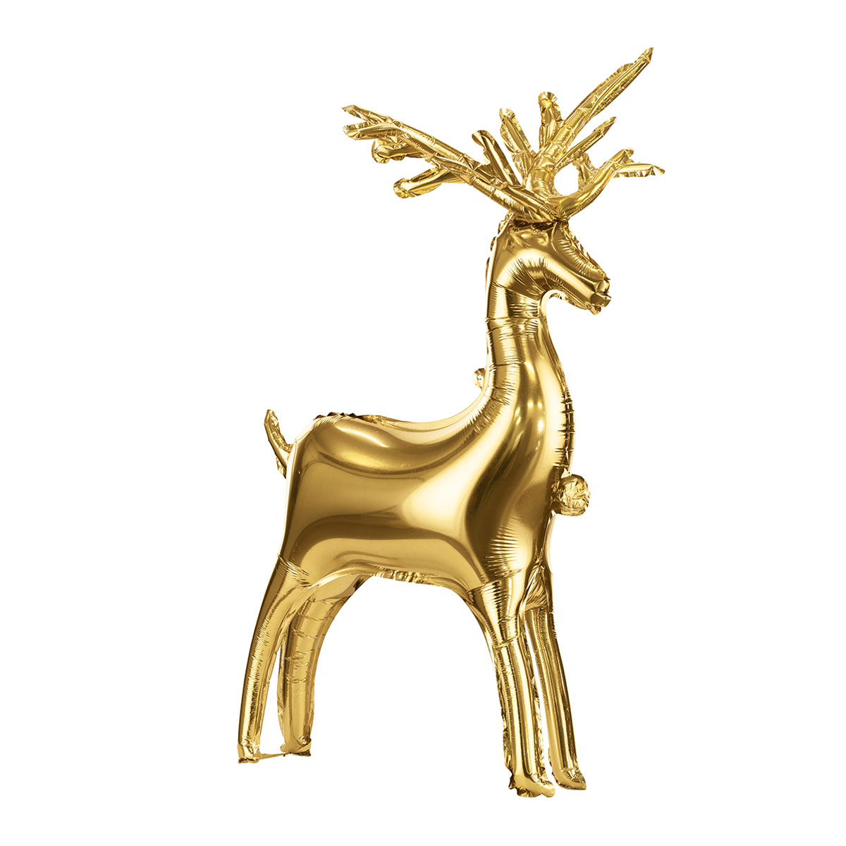 Stående Folieballong Ren Guld 73 cm omfattar en stående folieballong i form av en guldig ren. Ballongen kan fyllas med luft med det medföljande sugröret.