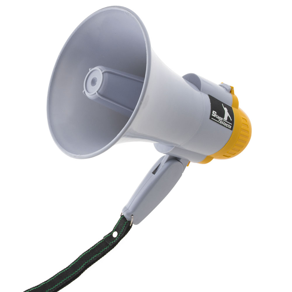 Stage Effects Megafon omfattar en grå och gul megafon med vikbart handtag och praktisk rem. Megafonen har musik-, inspelning- och uppspelningsfunktion samt ljudnivå på 40 db. Megafonen är ca 15,5 x 14,5 cm stor och drivs av 4x D-batterier. Tillverkad av plast.