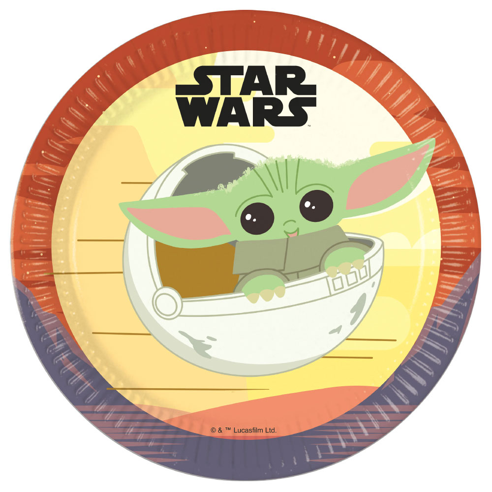 Star Wars Mandalorian Papperstallrikar omfattar tallrikar i papp med motiv av Baby Yoda och Star Wars text i olika färger. Tallrikarna mäter ca 23 cm stora.