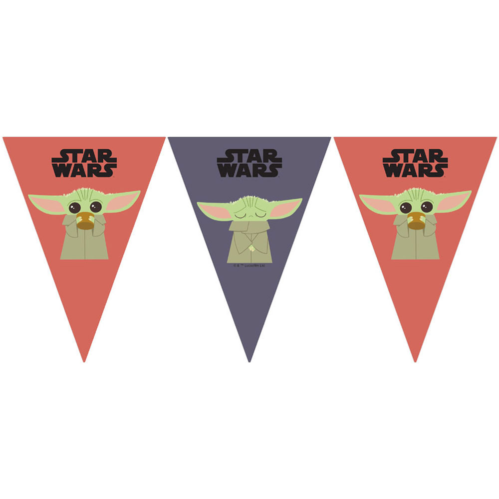 Star Wars Mandalorian Vimpelgirlang omfattar en girlang med flaggor i papp med "Star Wars" text i svart och motiv av Baby Yoda i grönt på ljusröd och blågrå bakgrund. Vimplarna är ca 25 cm höga och 18 cm breda och girlangen är ca 2,3 meter lång. Hängs upp med silvrigt band.