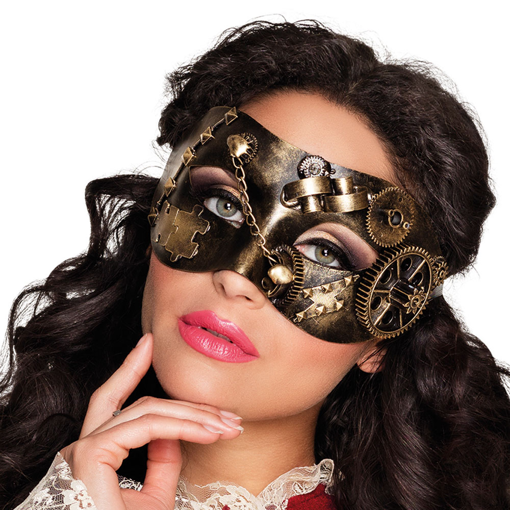 Steampunk Ögonmask innehåller en mässingsfärgad steampunk mask med många detaljer som exempelvis kugghjul och nitar. Masken har hål för ögonen och hålls på plats på ansiktet med hjälp av ett elastiskt band som träs runt huvudet.