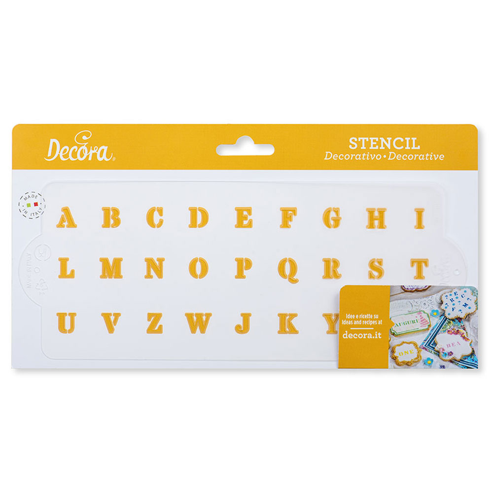 Stencil Bokstäver består av en stencil med stora bokstäver (A-Z) att använda till bakelser med glasyr, smörkräm, vaniljsocker, kakao och liknande. På förpackningens baksida finns instruktioner för hur stencilen ska användas. Stencilen är tillverkad av plast.