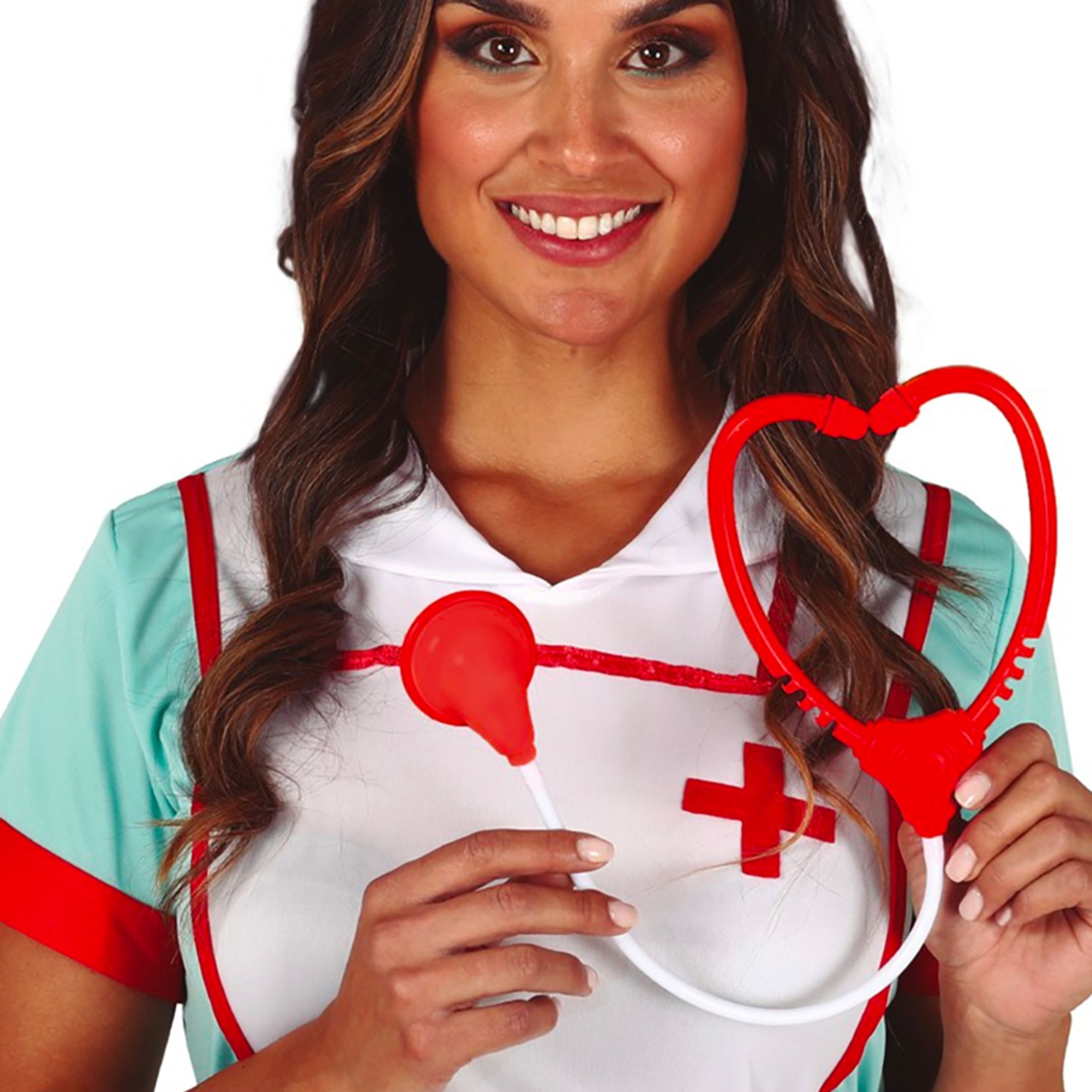 Stetoskop Röd är ett rött och vitt stetoskop som kan användas på bland annat på maskerader och temafester.