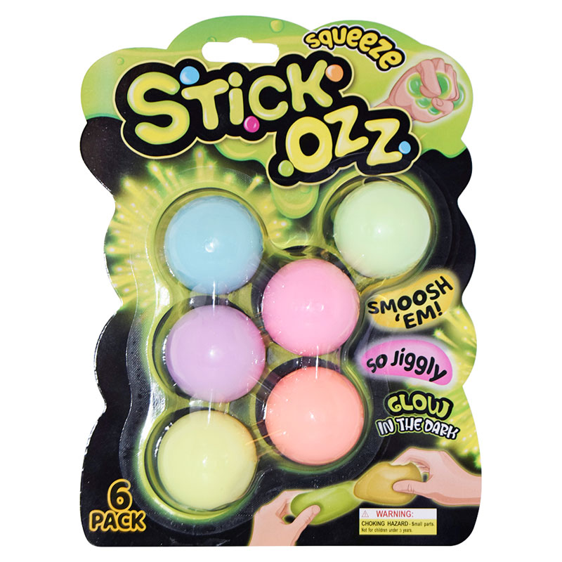 Stick Ozz Klämbollar Glow In The Dark 6-pack omfattar 6 st pastellfärgade klämbollar med klibbig yta och som lyser i mörkret. Den klibbiga ytan gör att bollarna fastnar i till exempel taket eller på väggen. För att få tillbaka klistrigheten skölj klämbollarna med tvål och ljummet vatten. Bollarna är tillverkade av gummimaterial och är ca 4 cm stora. Ladda dem i ljus en stund för att få dem att lysa upp i mörkret.