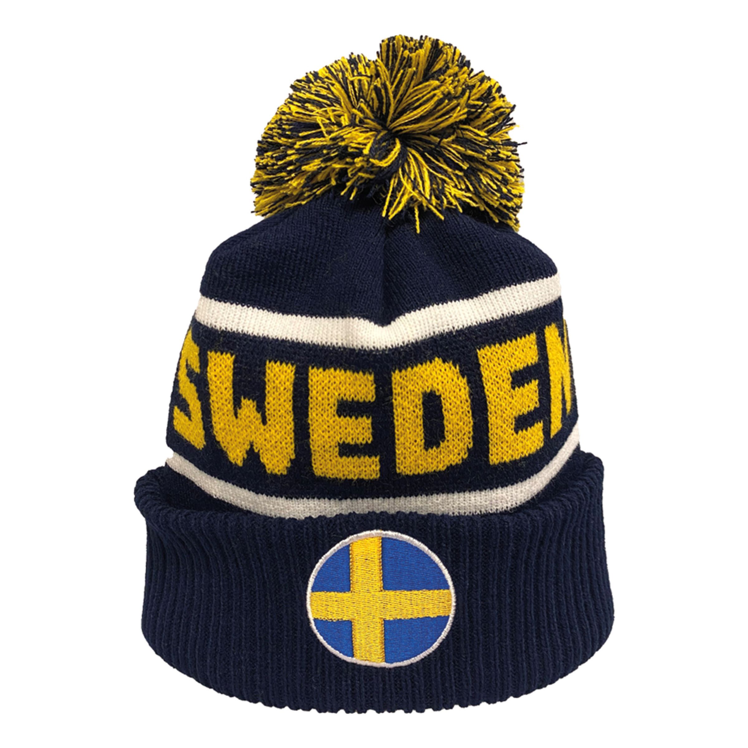Stickad Mössa Pom Pom Sweden håller dig varm och bekväm under den kalla svenska vintern. Mössan har en sverigeflagga broderad framtill och mörkblå pom pom uppepå.