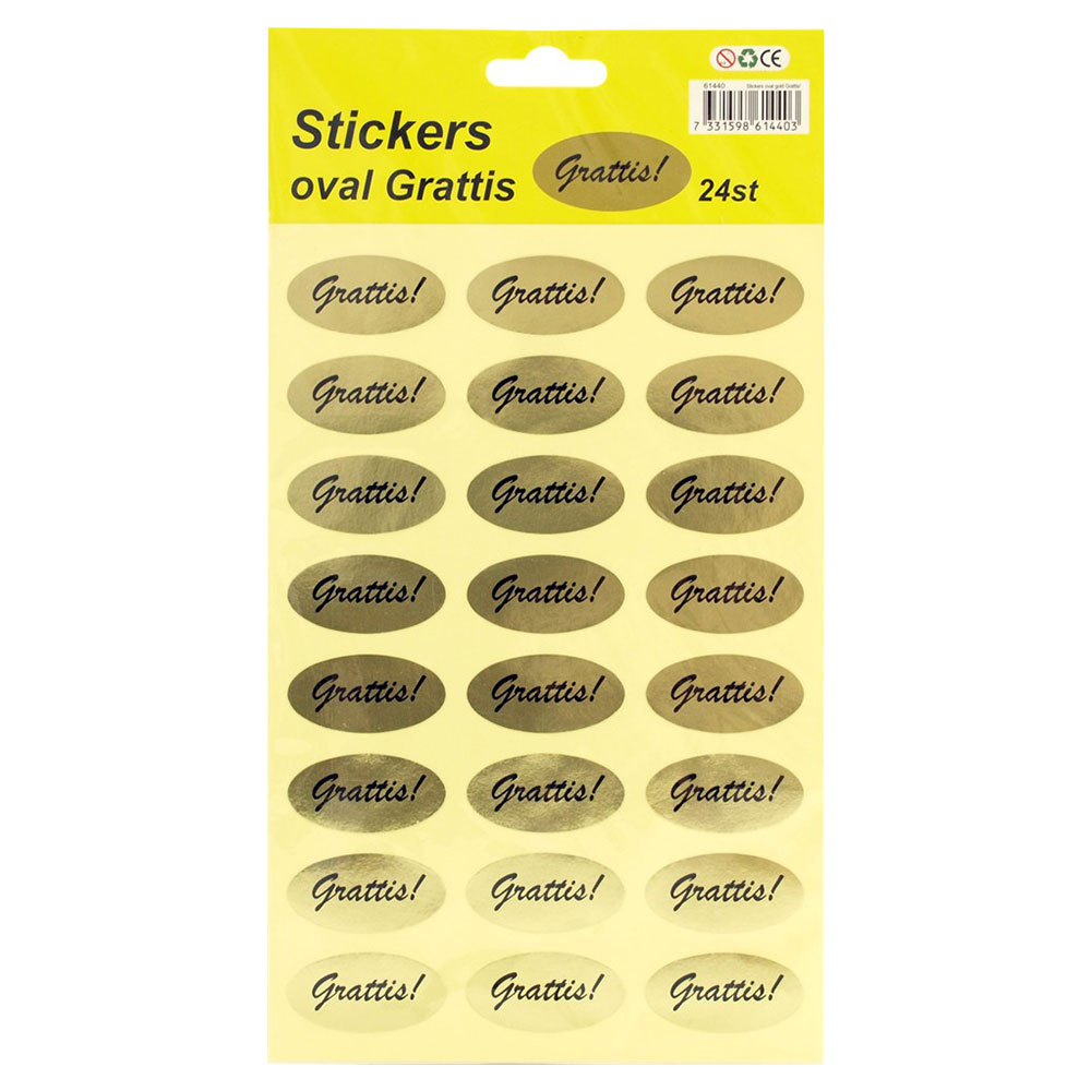 – Ovala guldstickers med "Grattis!" text.