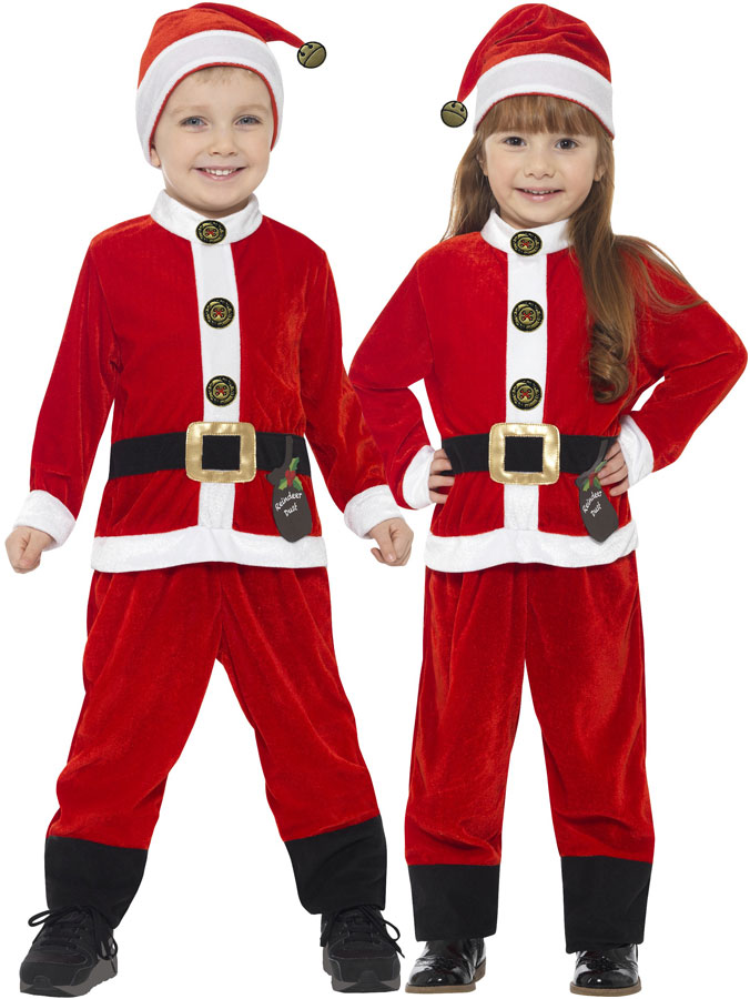 Stilig Tomtedräkt Barn innefattar en röd sammetsaktig overall med fastsydda detaljer såsom knappar på de vita delarna av dräkten, ett skärp och en liten påse där tomten förvarar sitt magiska renstoft (så att renarna kan flyga!). Till allt detta får du även en röd sammetsliknande tomteluva med ett tygmärke föreställande en bjällra på änden.