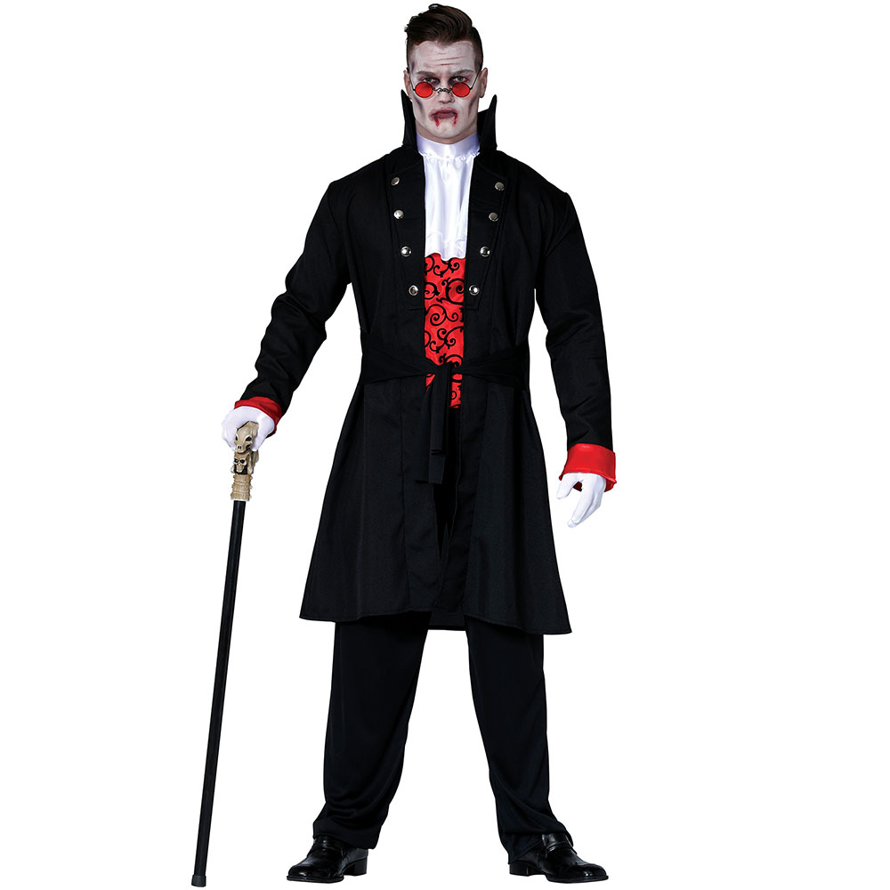 Stilig Vampyr Maskeraddräkt omfattar en vampyr maskeraddräkt med en vit jabot, ett par svarta byxor och en svart jacka med fastsydd röd och svart skjorta.