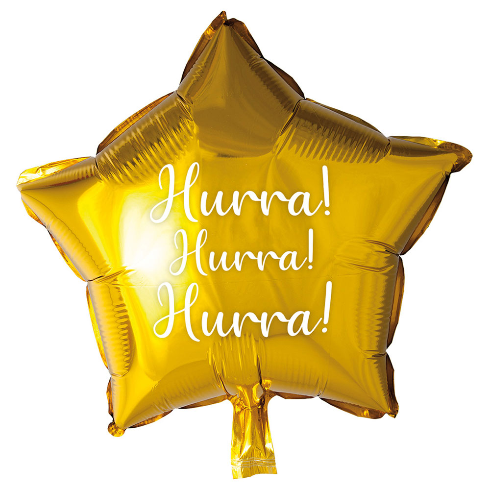 Stjärnballong Hurra Guld omfattar en stjärnformad folieballong i guld med texten "Hurra! Hurra! Hurra!" i vitt. Ballongen fylls med luft eller helium och är ca 46 cm stor.
