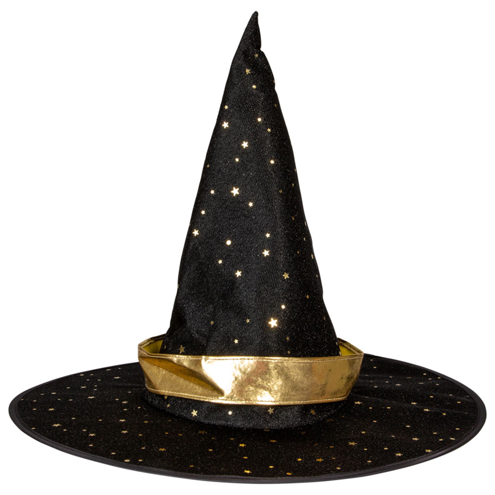 Stjärnor Häxhatt Barn omfattar en svart häxhatt, dekorerad med guldfärgade stjärnor och ett guldfärgat band.