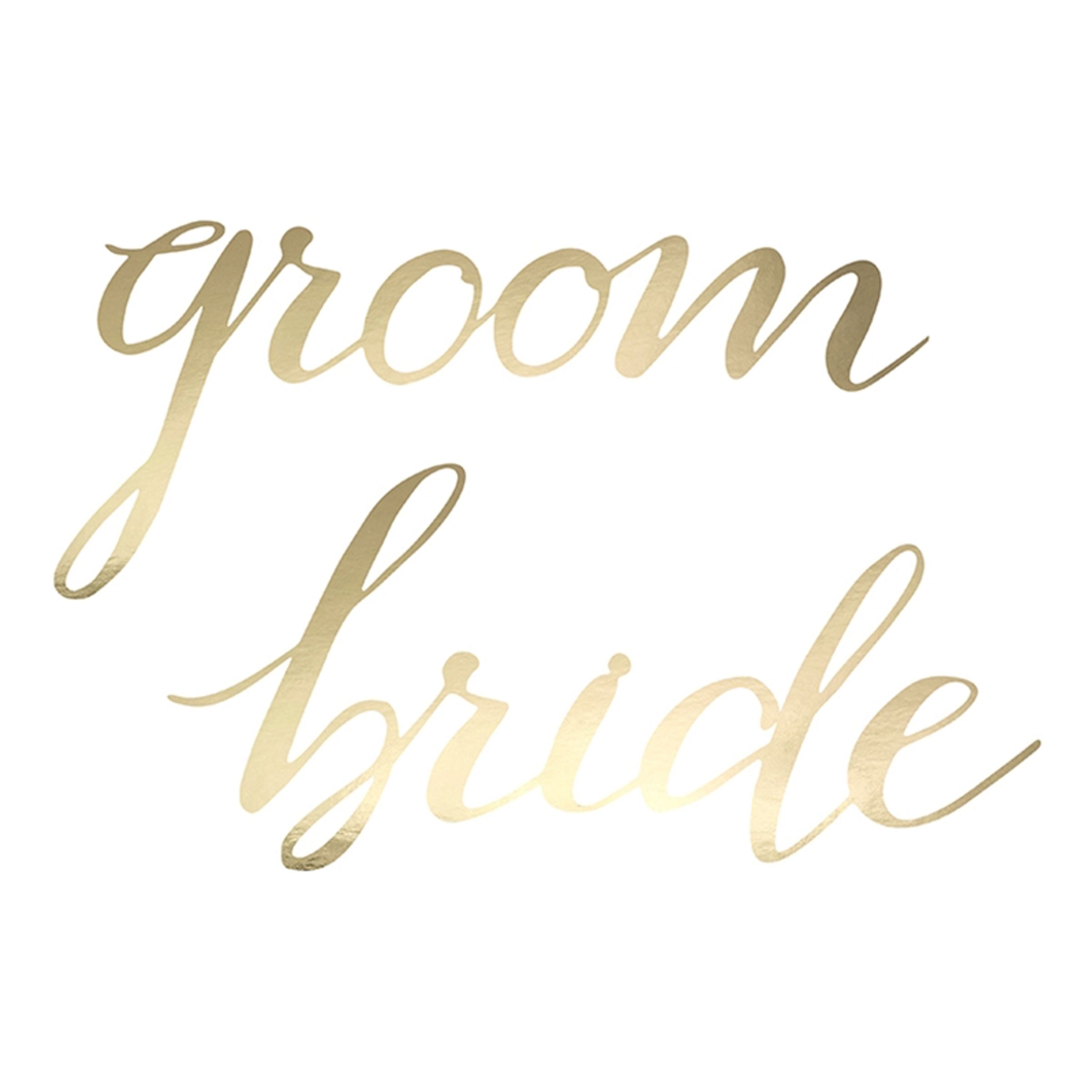 Stolsdekorationerna Bride & Groom är gjorda i guldpapper och är lätta att applicera på alla typer av stolsryggar. Kan kombineras med andra typer av dekorationer. Finns endast i guldpapper.