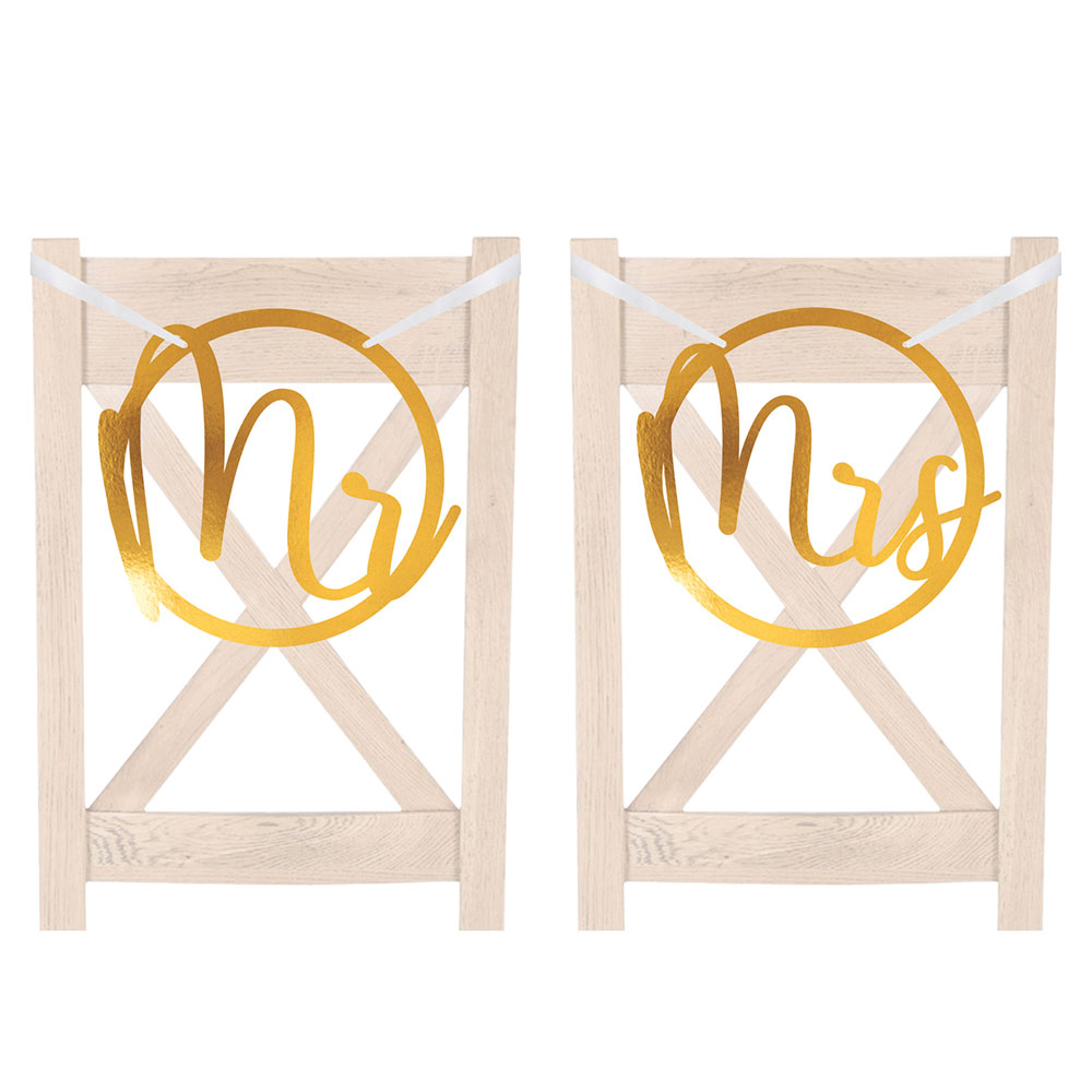 Stolsdekoration Mr & Mrs omfattar två stycken stolsdekorationer i guld med runda ringar och texten "Mr" respektive "Mrs". Dekorationerna hängs på stolsryggen med vitt brett sidenliknande band. Stoldekorationerna är ca 30 cm breda och 18 cm långa och är tillverkade i papp.