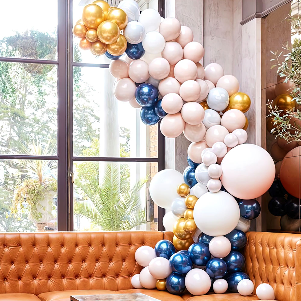 Dekorativt ballongbåge kit som snabbt förvandlar hemmet eller festlokalen till en riktigt brakfest! Ett imponerande ballongdekoration kit med hela 200 latexballonger i snygga nyanser av vitt, mörkblått, guld och puderrosa som garanterat livar upp hela din fest. Ett utmärkt val för alla som drömmer om att dekorera kalaset med en riktigt proffsig ballongpyntning.