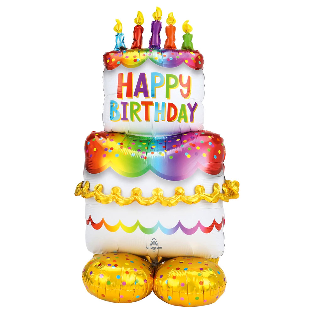 Stor Födelsedagstårta Folieballong omfattar en stor folieballong i två delar som föreställer en vit födelsedagstårta med texten "Happy Birthday" samt färgglada detaljer. Ballongen fylls med luft och är ca 134 cm hög och 68 cm bred. Rör för uppblåsning samt elastiskt band för att fästa ballongens delar medföljer.