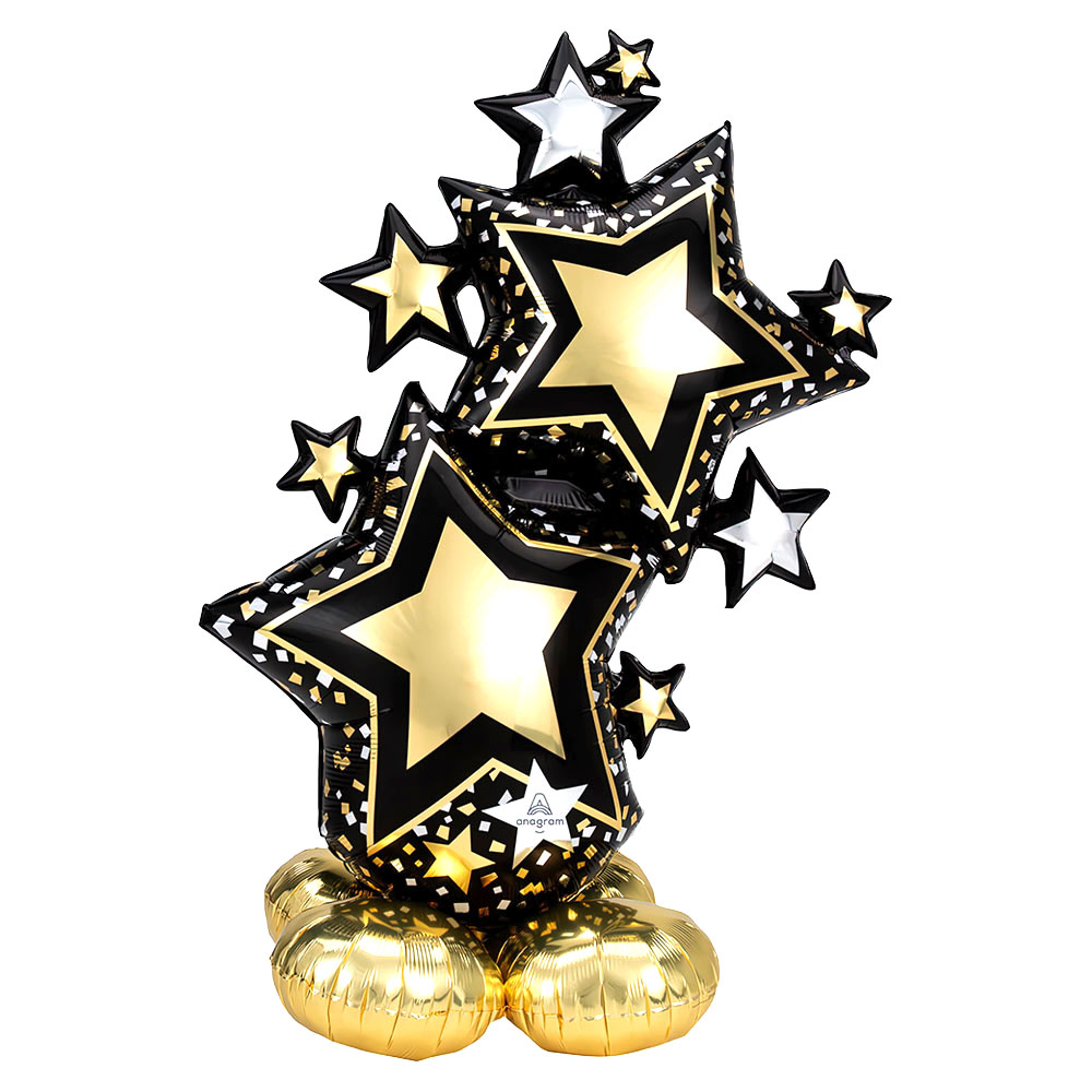 Stor Folieballong Stjärnor omfattar en stor folieballong i två delar som föreställer fina stjärnor i guld, silver och svart. Ballongen fylls med luft och blir ca 149 cm hög samt 86 cm bred. Medföljer även ett elastiskt band för att fästa ballongens delar.