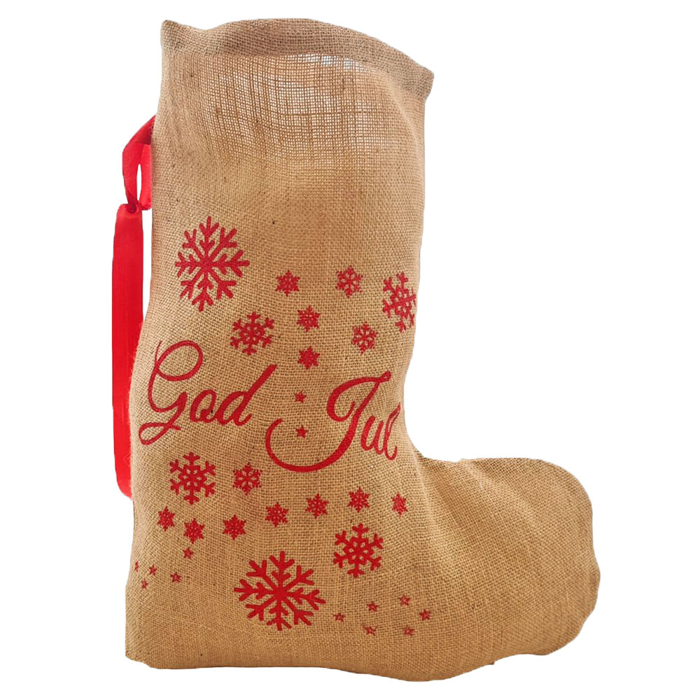 Stor Julstrumpa med Julmotiv Jute omfattar en stor julklappsstrumpa med rött tryck av stjärnor, snöflingor och "God Jul" text. Strumpan är gjord i juteväv och är 50 cm lång och kommer med ett rött band att hänga upp i.