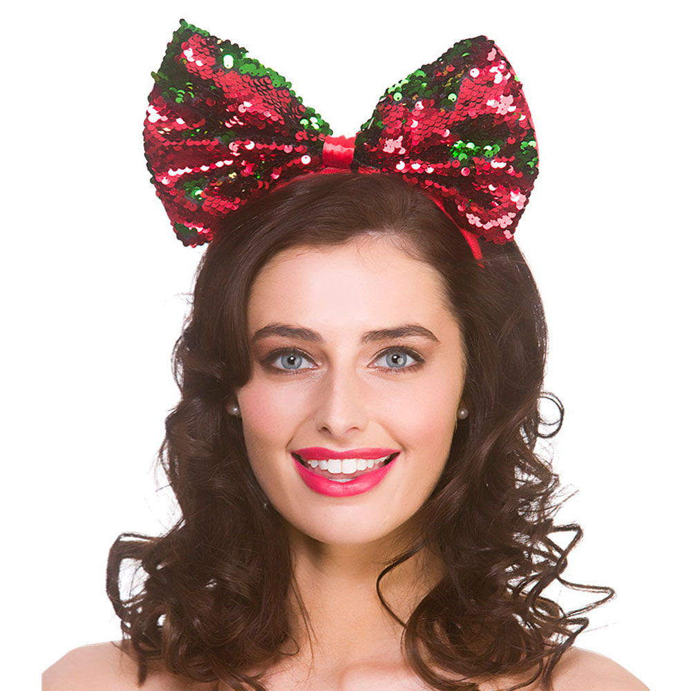 Stor Paljett Rosett på Diadem innehåller ett rött diadem med en stor skimrande rosett med röda och gröna paljetter på framsidan.