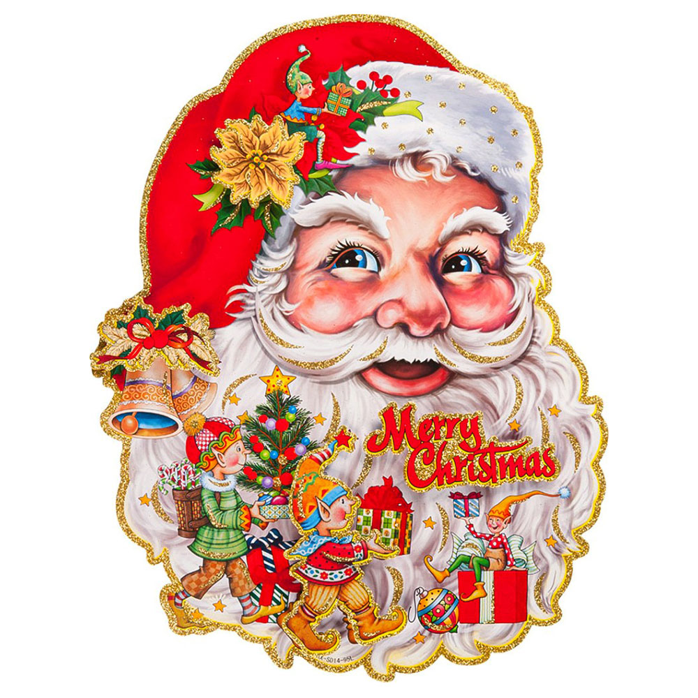 Stor Pappersdekoration Jultomte omfattar en stor pappersdekoration som föreställer en jultomte med silver glittriga detaljer, texten "Merry Christmas" och fina 3D-effekter. Pappersdekorationen är ca 70 x 56 cm stor och kan fästas mot exempelvis en vägg med tejp eller liknande.