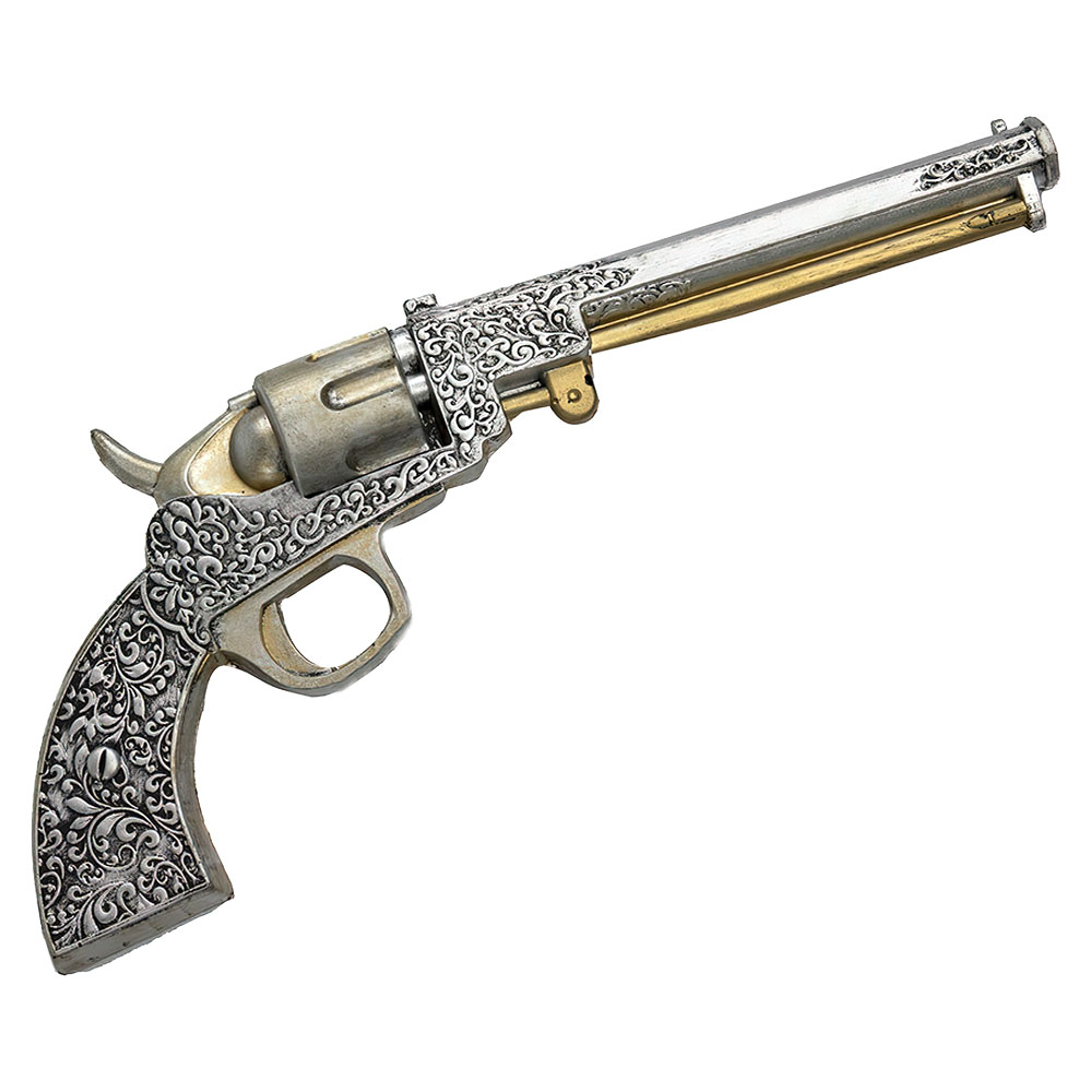 Vare sig du är en cowboy i vilda western eller en pirat på de sju haven så bör du alltid vara redo för revolverduell, och det kan du enkelt bli med denna häftiga skumrevolver! Stor låtsas-pistol i revolvermodell som blir ett utmärkt tillbehör till både pirat och cowboy maskerad utklädnader. Den silvriga färgen och de snirkliga detaljerna får den att nästan se riktig ut, vilket gör den till det ultimata maskeradvapnet för alla som önskar en riktigt tuff look!