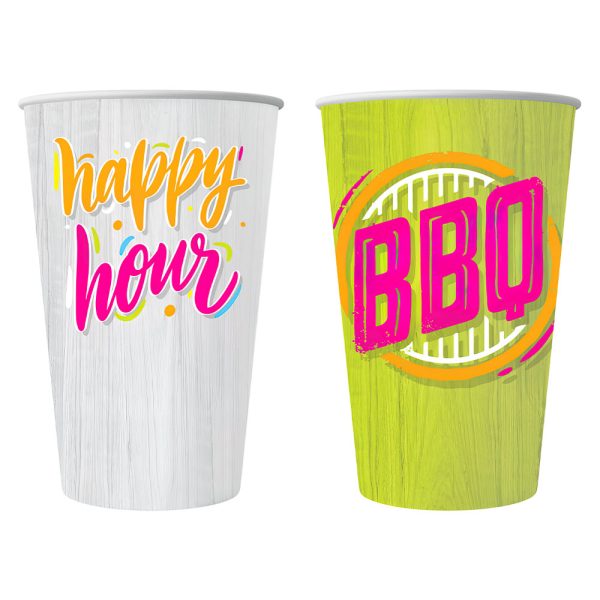 Stora Pappersmuggar Sommar omfattar ett 6-pack stora färgglada pappersmuggar med texterna BBQ och Happy hours.