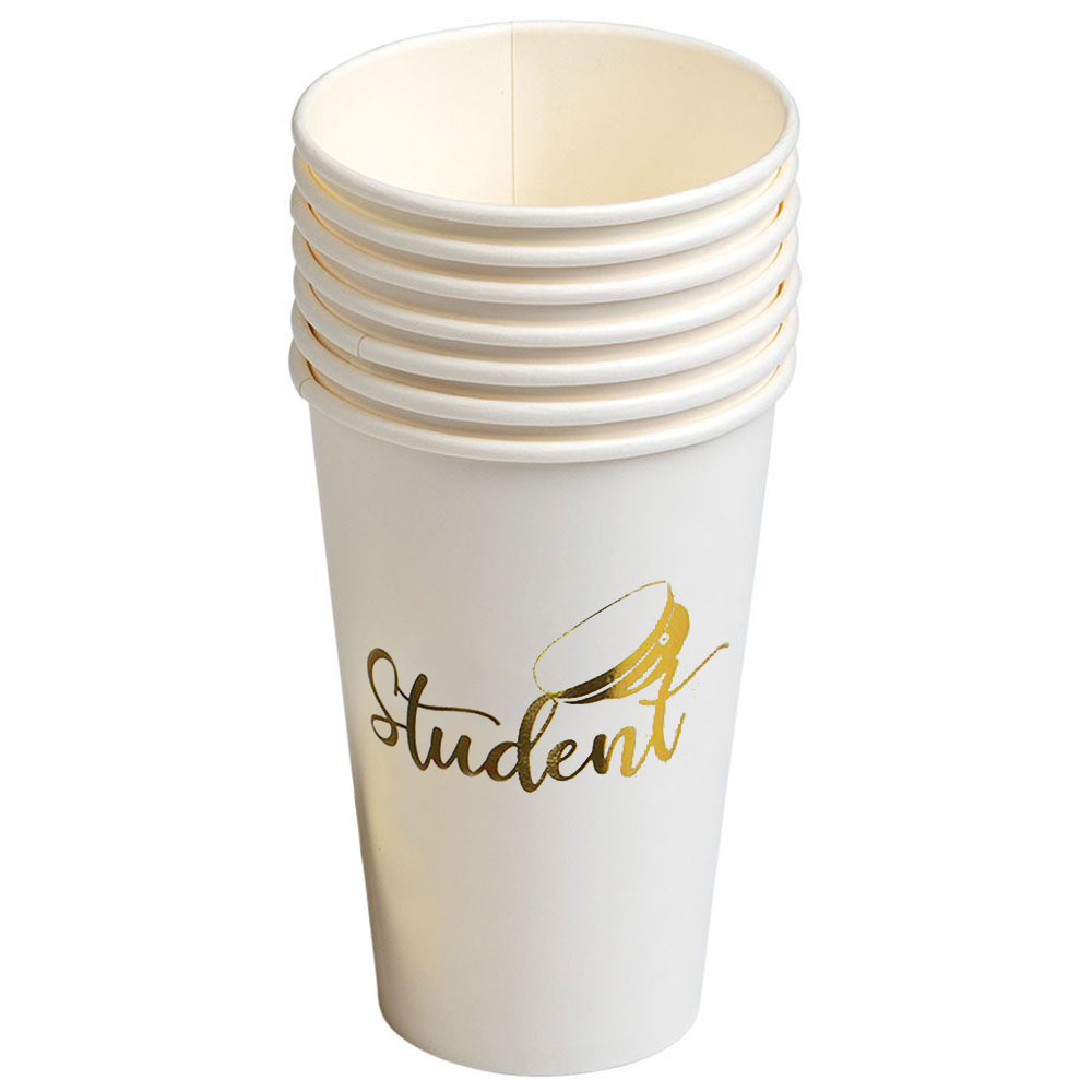 Stora Student Pappmuggar omfattar stora vita pappmuggar med guldig "Student" text. Muggarna är ca 13 cm höga och kommer i 8-pack.