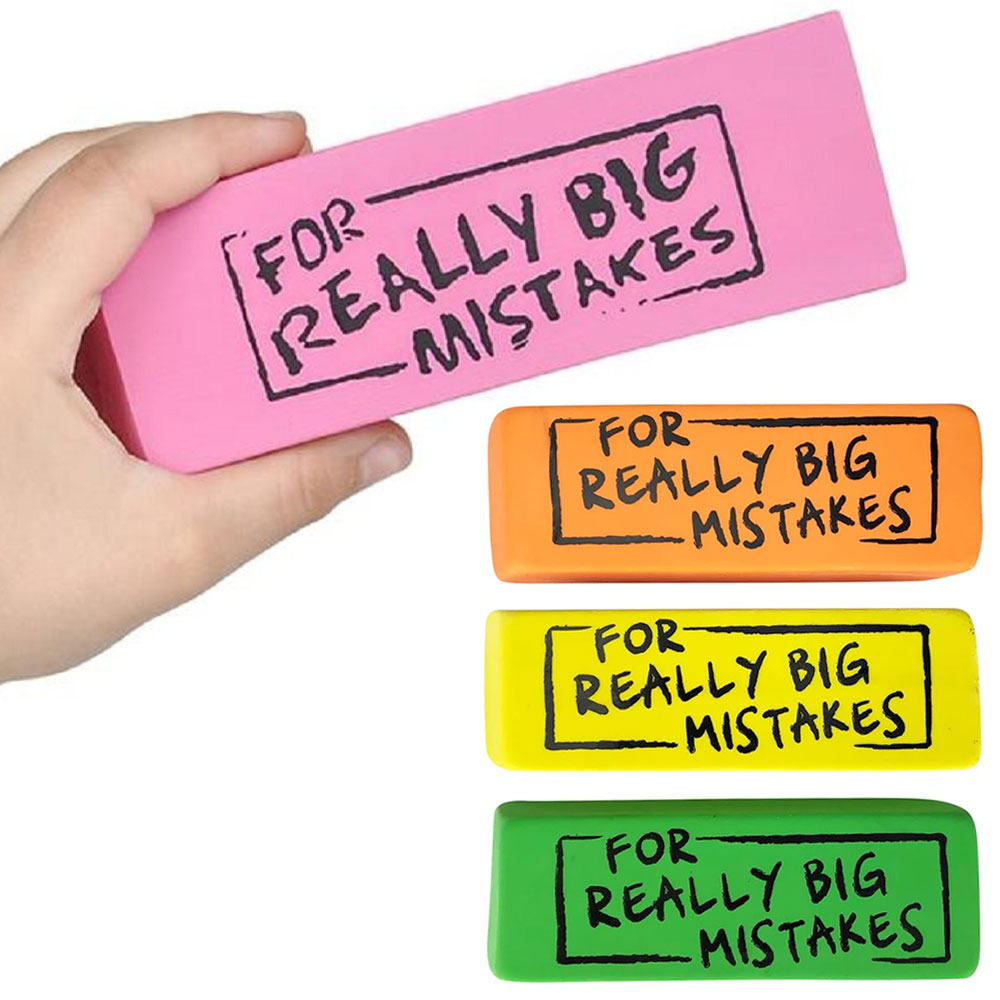 Stort Suddgummi XL omfattar ett väldigt stort suddgummi med texten "For really big mistakes". Finns i färgerna gul, rosa, orange och grön.