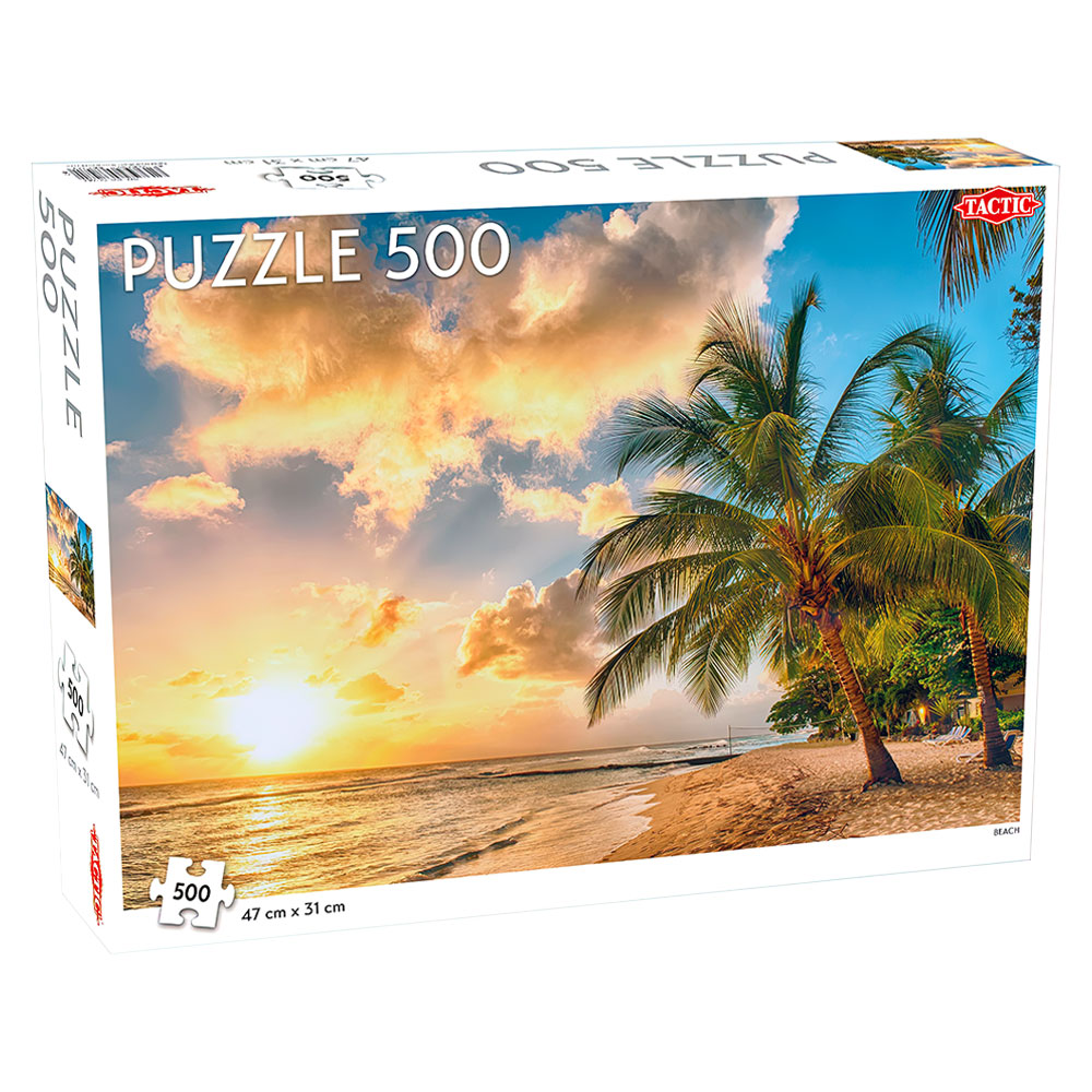 Strand Pussel omfattar ett pussel med motiv av en strand med palmer på 500 bitar. Pusslet håller hög kvalitet och är tillverkat med hänsyn till miljön. Färdigt pussel mäter 31 centimeter långt och 47 centimeter brett.