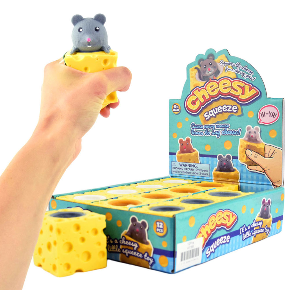 Stressleksak Mus i Ost omfattar en klämleksak i form av en gul ost där det gömmer sig en liten mus. När du klämmer på osten ploppar mushuvudet fram. Klämleksaken är ca 5 cm stor och tillverkad i mjukt gummi. Finns med grå, vit eller brun mus, vilken du får blir en överraskning.