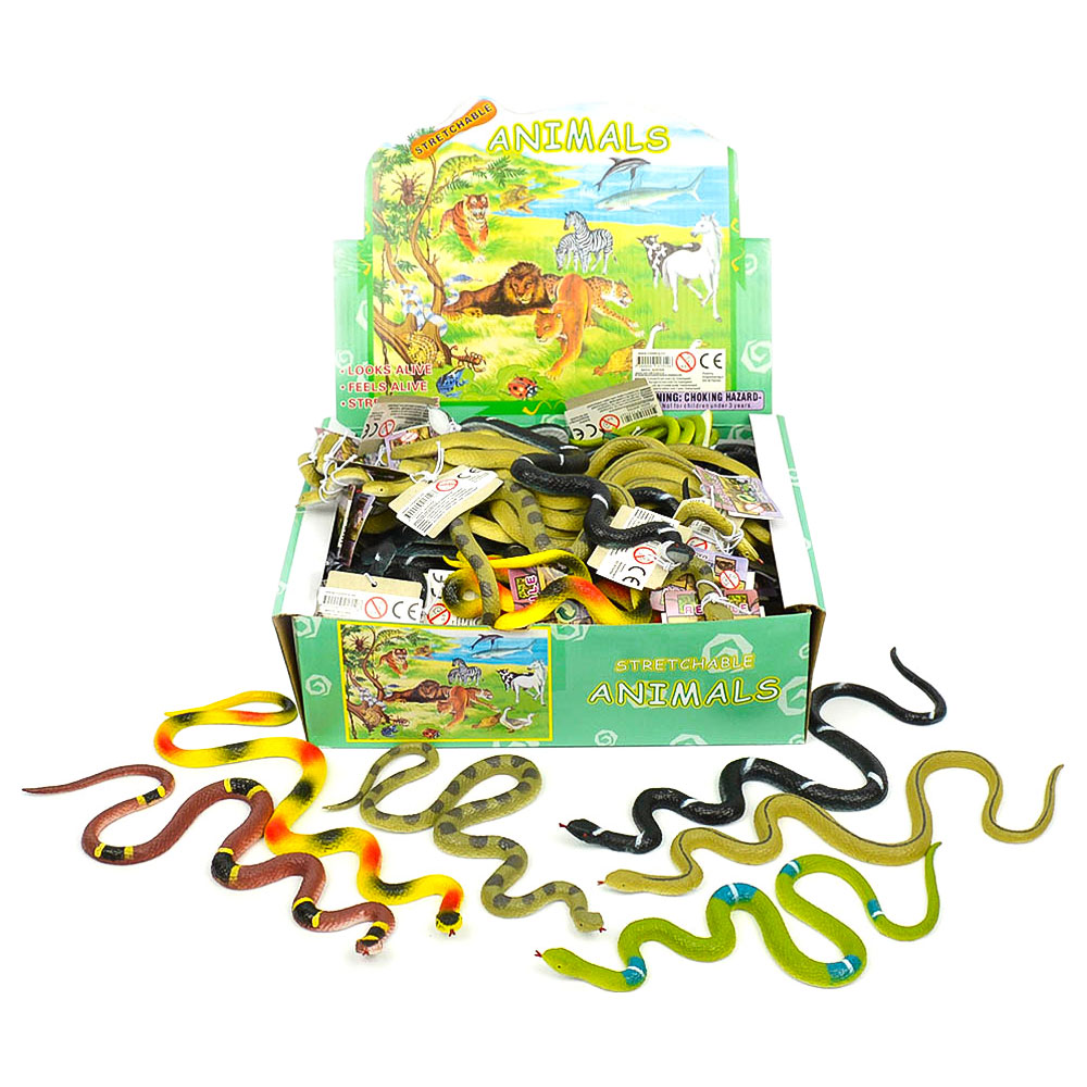 Stretchig Gummiorm omfattar en stretchig leksaksorm av gummimaterial. Ormen är ca 27 cm lång och finns i flera färger, vilken färg du får slumpas.