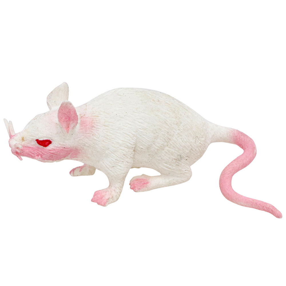 Stretchig Råtta omfattar en stretchig dekoration i form av en vit och rosa råtta med röda ögon.
