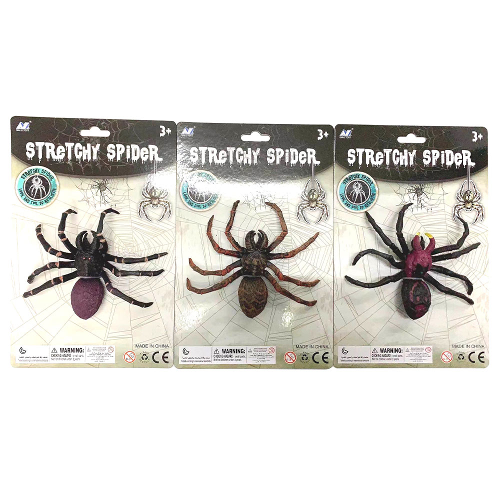 Stretchig Spindel Leksak omfattar en stretchig leksak i form av en spindel. Finns i färgerna svart, brun och mörklila med olika detaljer.