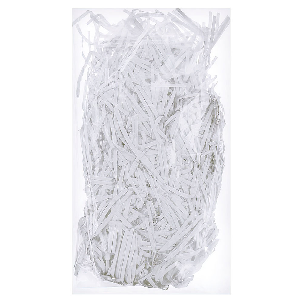 Strimlat Silkespapper Vit omfattar 30 gram strimlat silkespapper i vitt för utfyllnad och dekoration i presentinslagningar och liknande.
