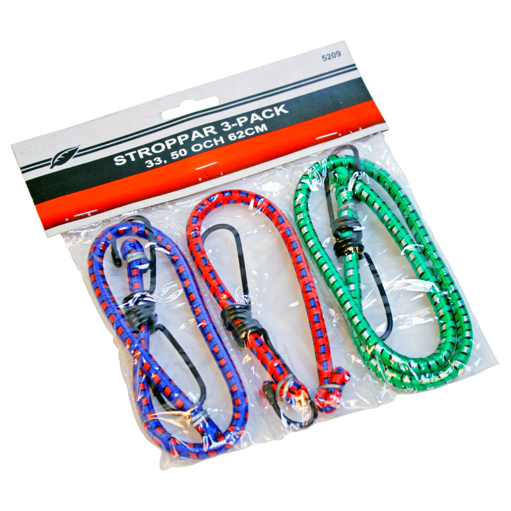 Stroppar består av elastiska spännband med fästkrokar. Stropparna mäter 33, 50 och 62 centimeter långa. Tillverkade i gummi, polyester, metall och plast. Säljs i 3-pack.