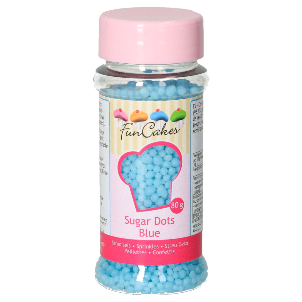 Strössel Sugar Dots Blå omfattar 80 gram blått strössel i form av små kulor på burk. Strössel är färgat med naturliga färgämnen.