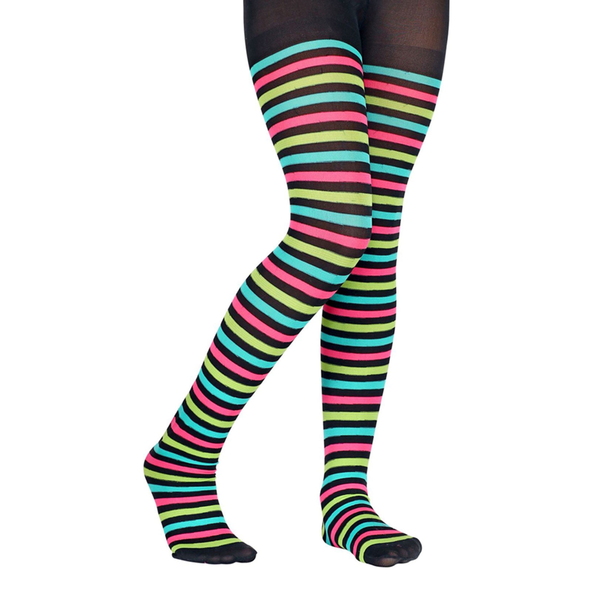 Strumpbyxor för Barn Randiga är blå, rosa och grönrandiga strumpbyxor i barnstorlek.