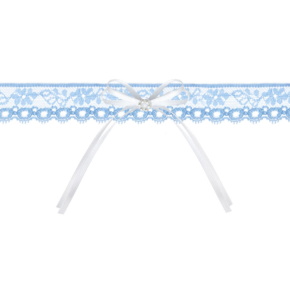 Strumpebandshållare Ljusblå omfattar en strumpebandshållare i ljusblått med vitt satinband och vita små pärlor framtill. Strumpebandshållaren är tillverkad av polyamid och elastan, och passar vuxna.