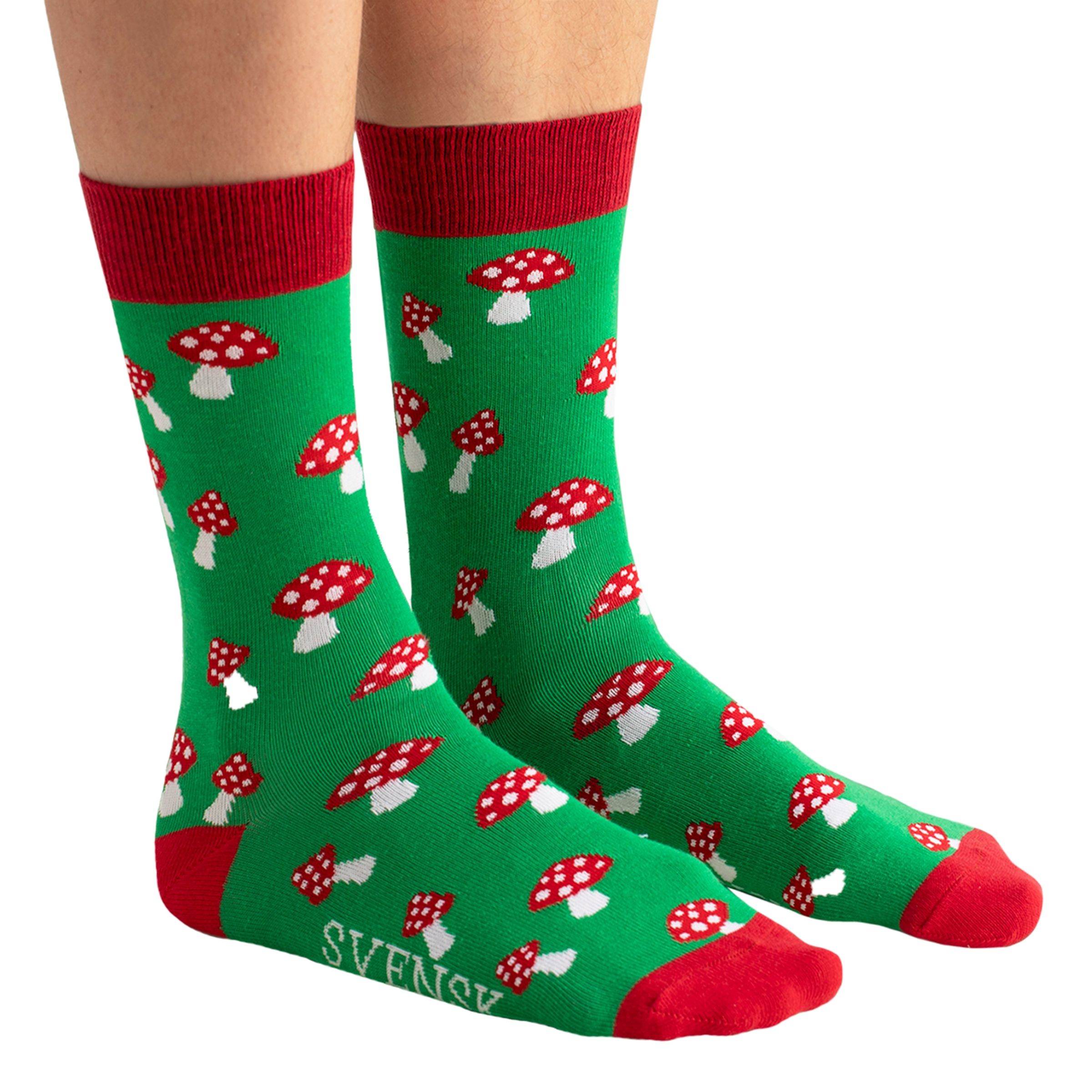 Strumpor Flugsvamp består av ett par gröna strumpor från Svensk Husman som kommer med motiv föreställande röda flugsvampar. Strumporna kommer av ett mjukt och stretchigt material och finns i två olika storlekar för vuxna.
