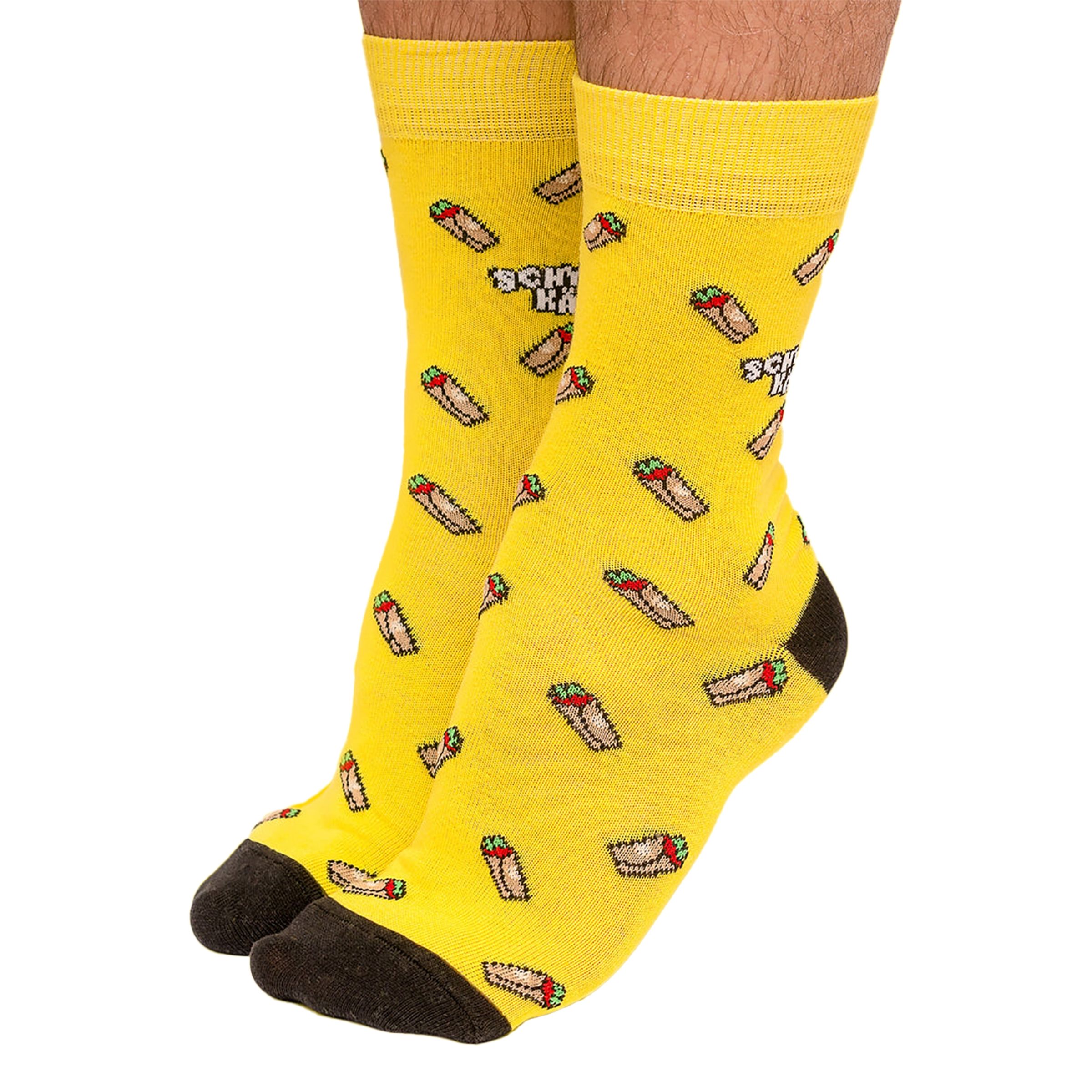 Strumpor Kebab innehåller ett par gula strumpor från Svensk Husman i en kollaboration med SCHYSST KÄK som passar perfekt att ge bort som present – för det är alltid bra med ett extra par strumpor. En klockren fars dag-present eller julklapp!