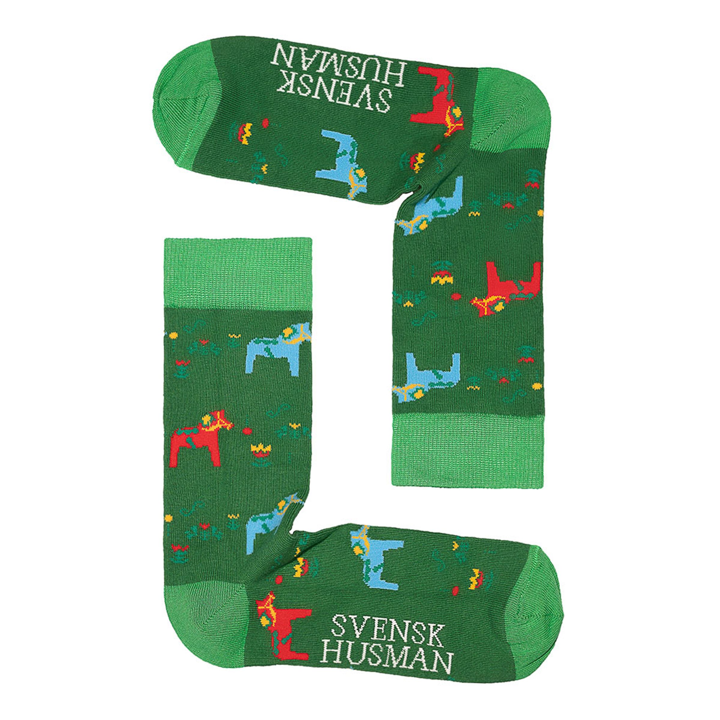 Dalahäst med Dalahästar innehåller ett par härliga strumpor med motiv föreställande den klassiska dalahästen. Strumporna är tillverkade i 80% bomull, 17% polyamid och 3% elastan. Finns i storlekarna 36-40 och 41-46. Välj mellan färgerna blå/gul och grön!