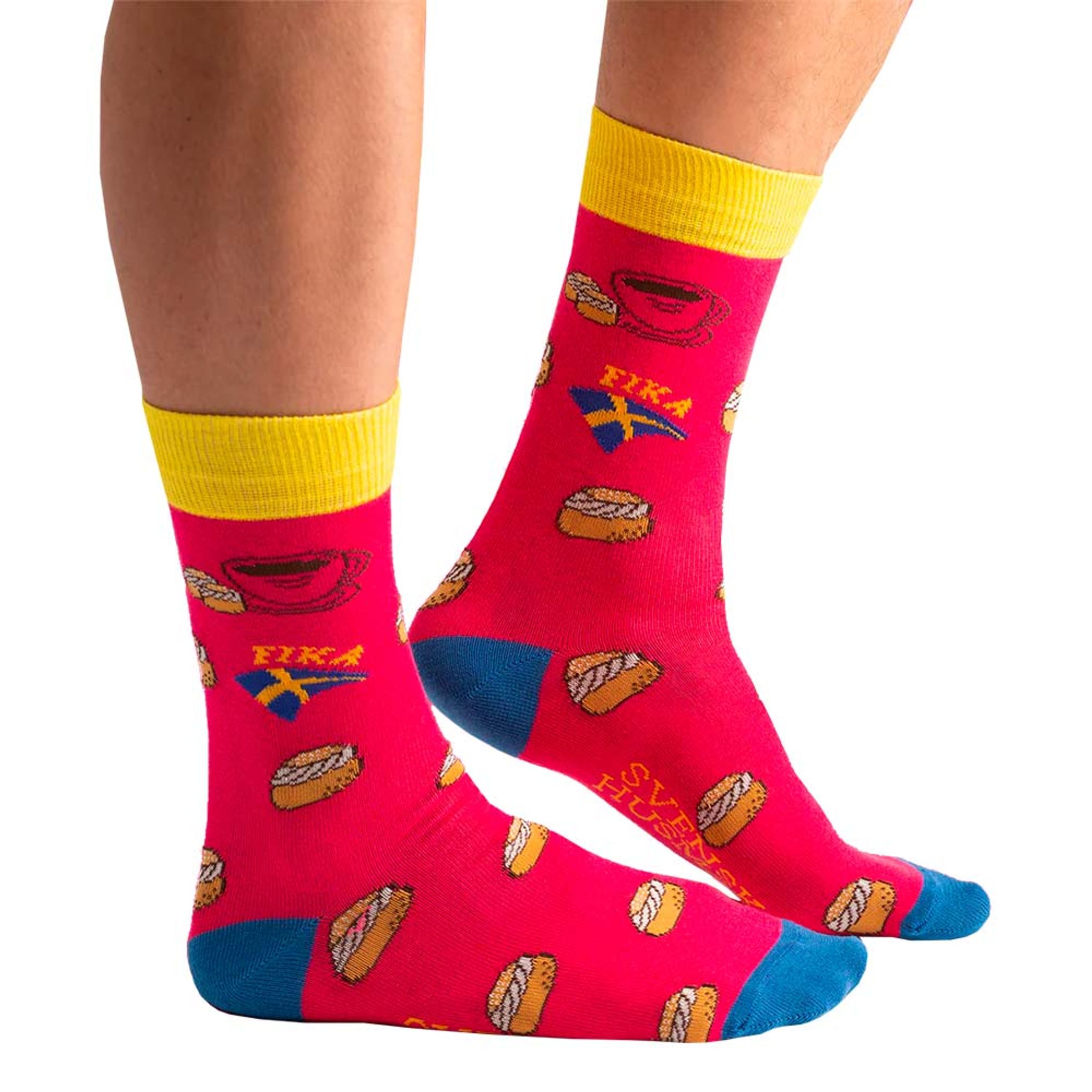Strumpor Semla är ett par helschyssta strumpor som når upp till anklarna. Strumporna har motiv av semlor, svenska flaggan och texten "Fika". Perfekt present till någon som älskar fikabröd!