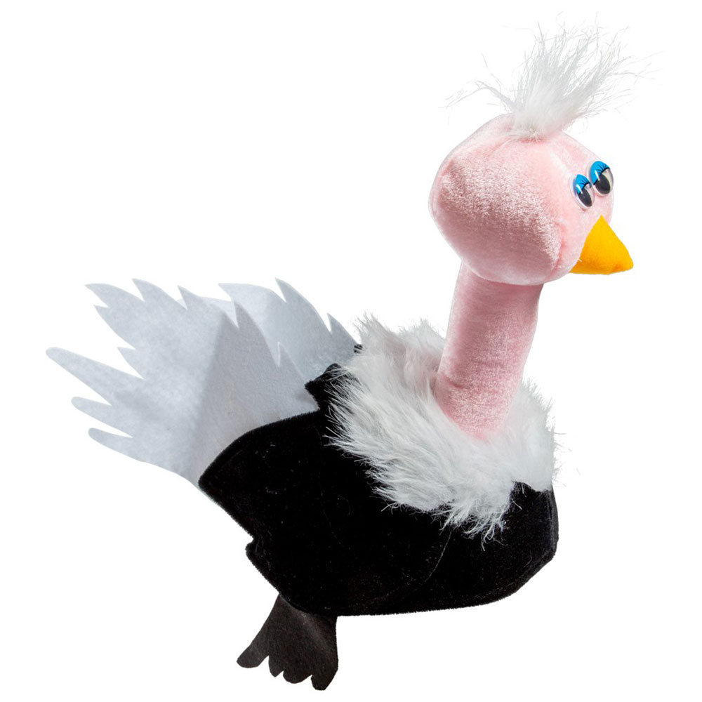 Strutshatt omfattar en söt maskeradmask föreställandes en struts med svart kropp, vita vingar, en fluffig vit man och en rosa hals med en ståltråd i sig så den håller formen.