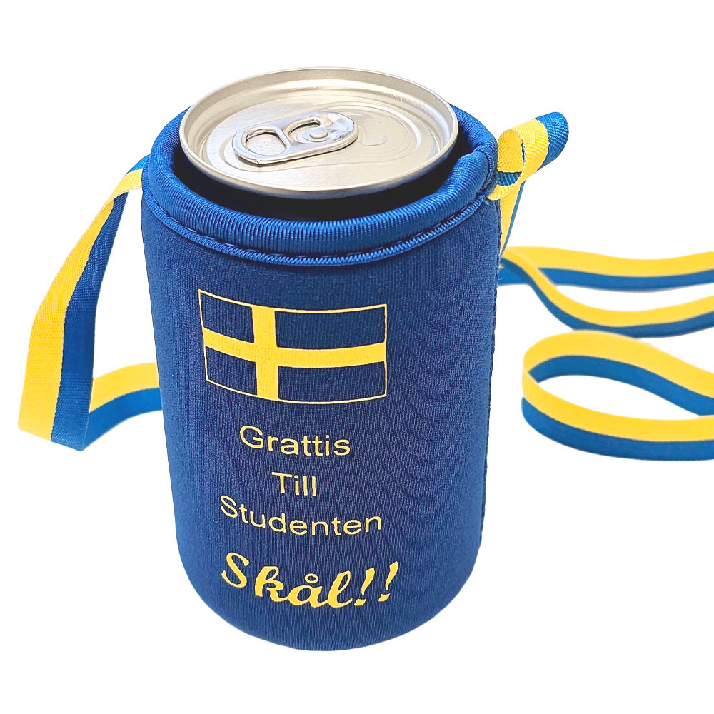 Student Burkhållare 33cl är en blå burkhållare i ett mjukt material med ett blå/gult band och texten "Grattis Till Studenten Skål!!". Burkhållaren kan hålla en 33cl burk.