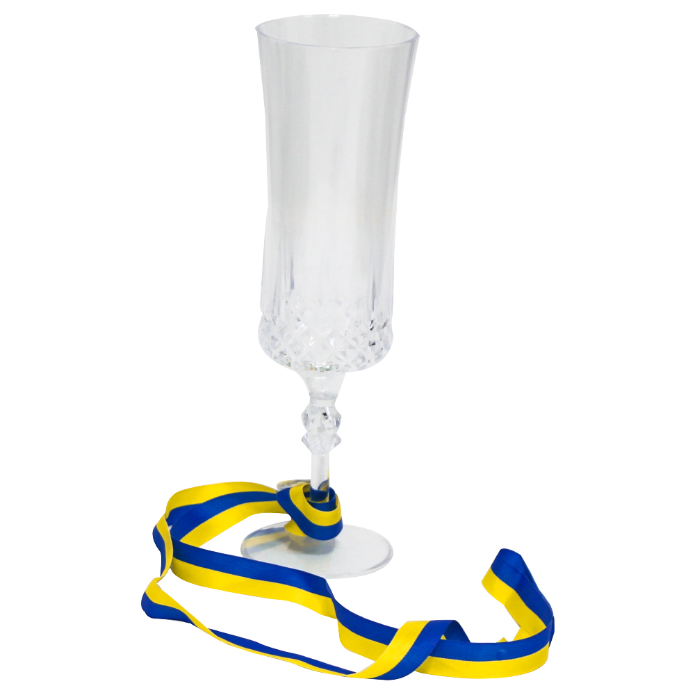 Student Champagneglas med Band omfattar ett genomskinligt mönstrat champagneglas i hårdplast. Champagneglaset har blågult band att hänga om halsen och är ca 22,5 cm högt.